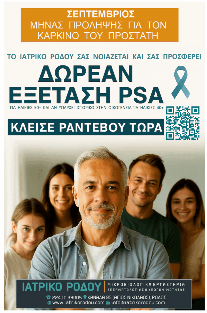 Το ΙΑΤΡΙΚΟ ΡΟΔΟΥ – Μικροβιολογικά Εργαστήρια, με αφορμή την Ευρωπαϊκή Ημέρα κατά του καρκίνου του προστάτη – 15 Σεπτεμβρίου – σας νοιάζεται και σας προσφέρει για όλο το μήνα Σεπτέμβρη, μία ΔΩΡΕΑΝ εξέταση PSA, του πρώτου όπλου που έχουμε για τη διερεύνηση του καρκίνου του προστάτη.